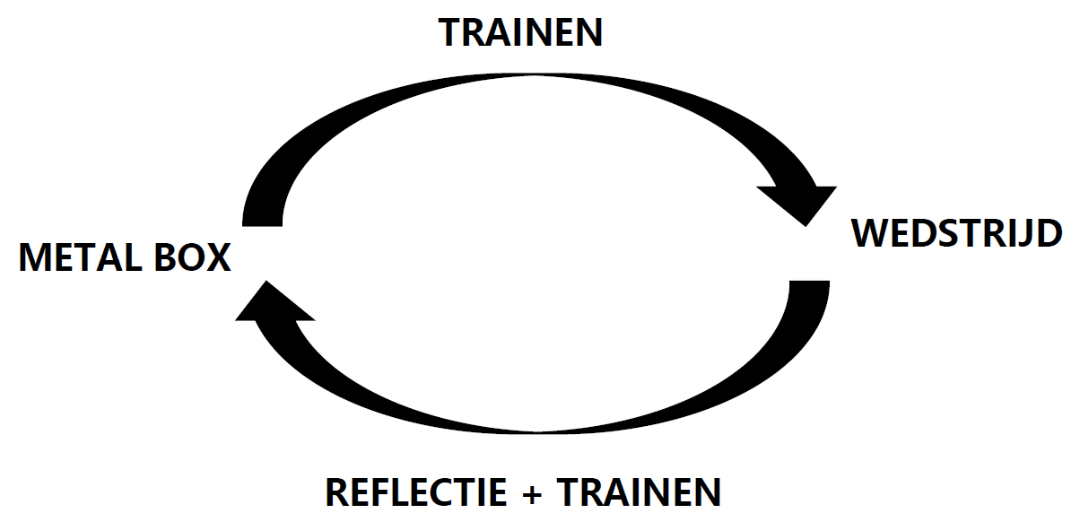 De Metal Box laat zien welke stappen je volgt voor het leren van vaardigheden tijdens het spelen van partijvormen 1v1 2v2 3v3. Nu is 'leren' de kern van het mens zijn want ieder mens heeft een natuurlijke behoefte om mogelijkheden en voorkeuren in vaardigheden tot ontplooiing te brengen. Wanneer er geen behoefte is om te leren is er dus iets wat het leren blokkeert - bv. een tekort aan motivatie (betekenis - passie), een meer negatief zelfbeeld of een tekort aan fysieke weerbaarheid!