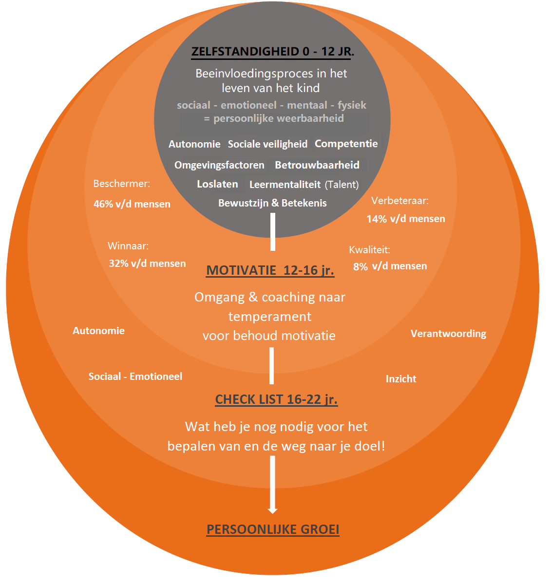 - De mate van intrinsieke motivatie en coachen naar karakter-temperament maakt de mate in doorzetten voor ontwikkeling en resultaat voor de lange termijn!